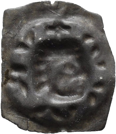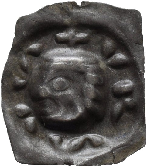 Kopf des Hl. Ursus nach links mit Stirnband, VRSVS, über dem Kopf Kreuz oder Stern, Perlkreis