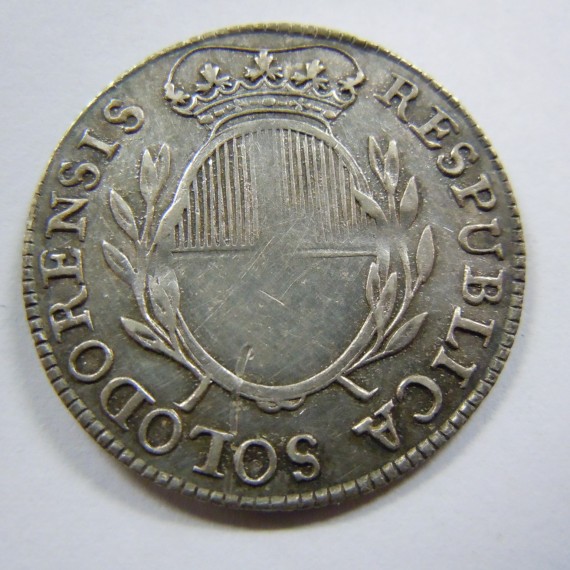 2-846-f 20 Kreuzer 1798 Vs. RESPUBLICA SOLODORENSIS senkrecht gestreiftes Wappen Rs. CUNCTA PER DEUM 1795 Material Ag Gewicht 4,08g Durchmesser 26mm Bekannte Stücke 1 Foto Beat Husi